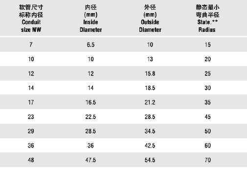 型號 軟管尺寸標(biāo)稱內(nèi)徑 內(nèi)徑 外徑 靜態(tài)最小彎曲半徑