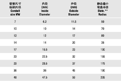 型號 軟管尺寸標稱內徑 內徑 外徑 靜態最小彎曲半徑